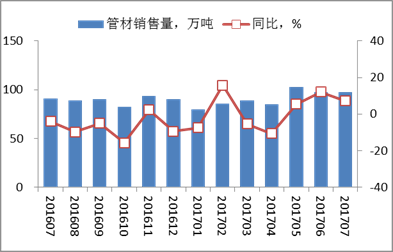 本月,重点钢铁企业销售管材97.68万吨,比去年同期增加6.47万吨,上升7.10%;截止本月,本年累计销售管材637.60万吨,累计比去年同期增加12.23万吨,上升1.96%。