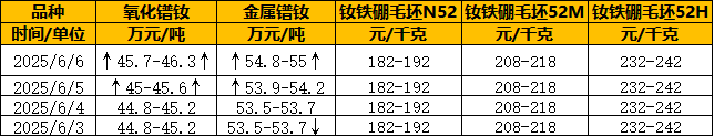 进入周后期,受相关消息面影响,镨钕产品价格显著拉涨,市场低价现货资源紧俏,成交价格重心持续上移。金属价格同步上调,但磁材企业采购仍以按需为主,对高价资源接受度较低,金属价格倒挂现象尚未缓解。尽管市场报价有所抬升,但下游实际接货量并未明显增加。