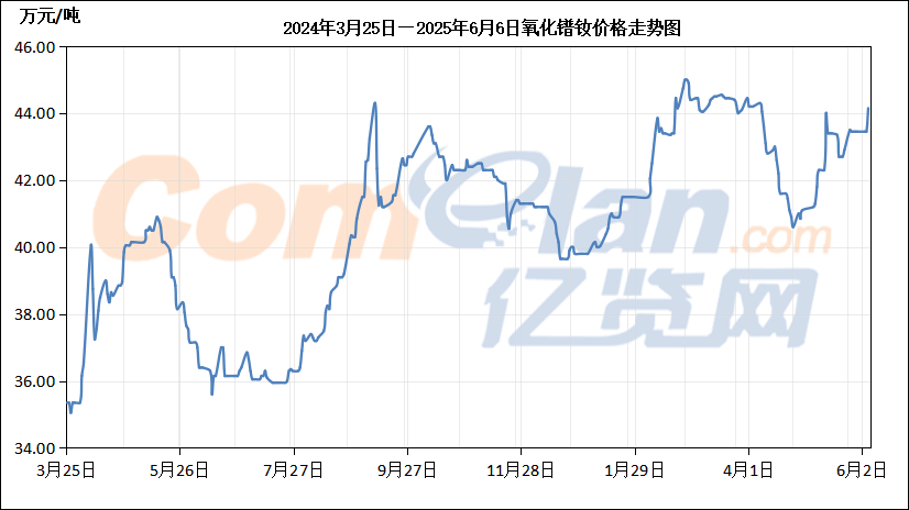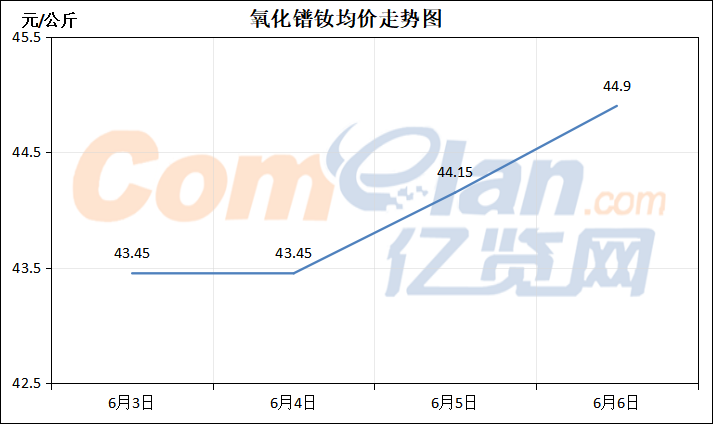 受此影响,单镨单钕价格也相应下调。其中,氧化钕报价在43.3-43.7万元/吨,金属钕报价