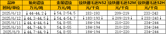 受此影响,单镨单钕价格也相应下调。其中,氧化钕报价在43.3-43.7万元/吨,金属钕报价