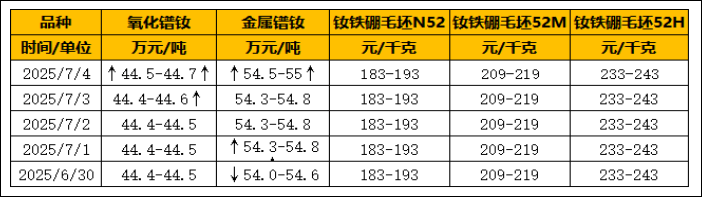 本周钕铁硼价格保持稳定。原料方面,稀土金属市场大体稳定、略有波动,金属镨钕与镝铁报价平稳,金属铽价格小幅上涨,成本端支撑力度尚可,磁材企业报价多呈平稳态势,下游需求端新增订单不多,以刚需补货为主,商家入市态度谨慎,后续仍需密切留意上游成本端及下游订单释放状况。