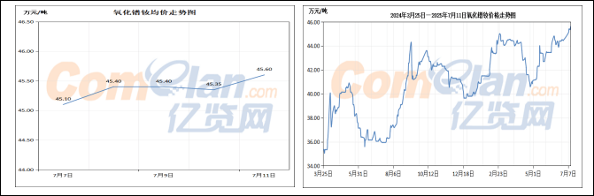 本周钬价呈上调趋势。周内,钬产品价格持续走高,受镝产品价格上调的带动,市场询单量有所增加,低价现货供应收紧,下游按需进行补货,市场报价随之上调,商家普遍存在看涨情绪,厂家报价也有所上移,当前氧化钬报价为52.5-53万元/吨。钬铁价格同样出现上调,不过磁材订单情况一般,下游接货量较少,金属厂实际出货量不多,当前钬铁报价在52.5-53万元/吨。