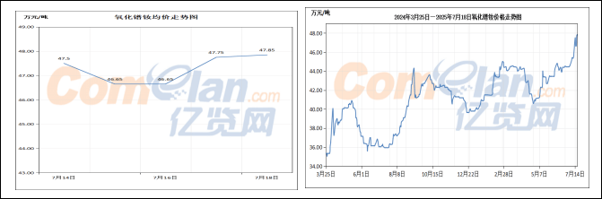 本周镨钕价格呈上涨态势。周初,市场整体行情向好,氧化物价格随期货价格强势上涨,高位达到48万元/吨;之后有消息称北方稀土将在稀交所平台竞拍出售金属镨钕,其起拍价为56.5万元/吨,报警价57.2万元/吨,因价格处于相对低位,导致市场情绪有所回落,氧化物价格下调至46.5- 46.8万元/吨,成交价格为46.7万元/吨;随后,稀交所金属镨钕的竞拍结果符合市场预期,连续三天每日100吨的金属全部售罄,且价格逐步上涨,这进一步增强了市场信心,氧化物价格随之上涨至47.5-48万元/吨。目前,氧化镨钕的报价在47.7-47.8万元/吨,金属镨钕报价为57.5-58.5万元/吨;氧化钕报价48 -48.5万元/吨,金属钕报价57.8-58.5万元/吨;氧化镨报价47.8-48.3万元/吨,金属镨报价62-62.5万元/吨。