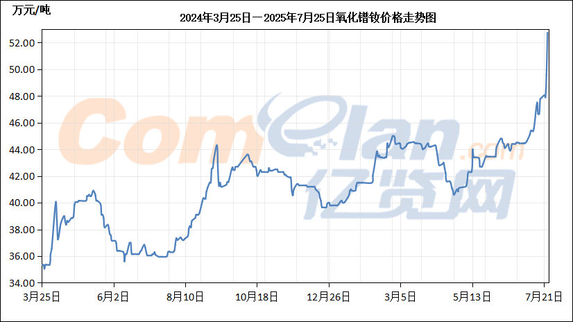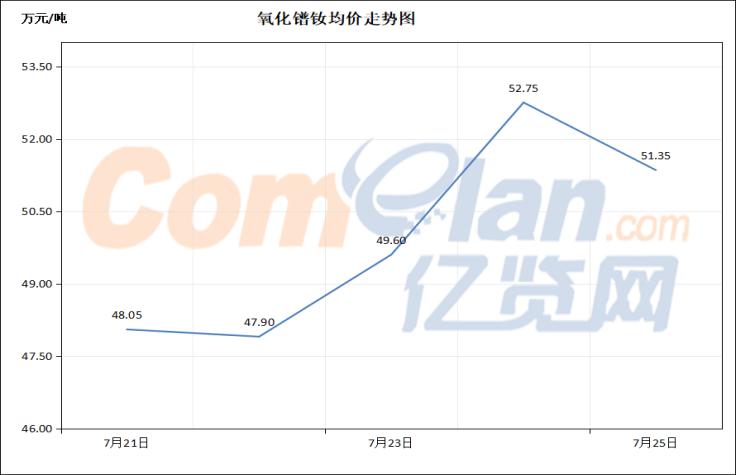 钬价格下调。周内钬产品价格走弱,受镝产品价格下调影响,市场询单减少,有低价现货报出,下游采购量小,市场报价下调,商家补货情绪一般,厂家报价下滑,当前氧化钬51.3-51.8万元/吨;钬铁价格下调,磁材订单一般,下游接货量少,金属厂出货不足,当前钬铁报价52-52.5万元/吨。