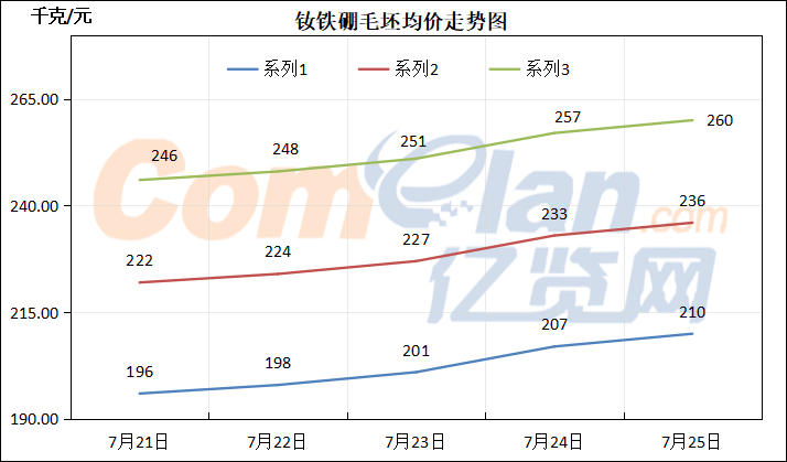 本周稀土磁材市场快速上行,交易活跃度明显提高。价格方面:上游稀土氧化物及金属价格的快速上涨传导至磁材环节,企业成本压力骤增。为转移成本压力,主流磁材企业普遍上调了产品报价。