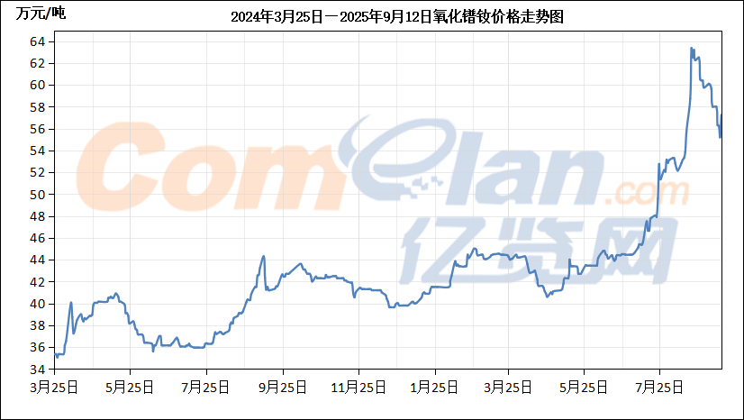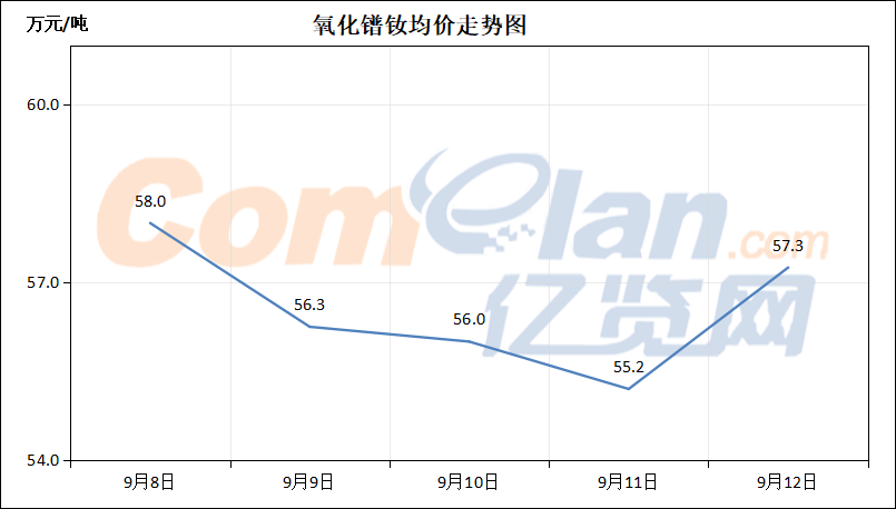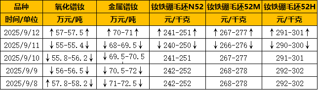 镨钕市场本周镨钕均价下调,整体走势跌后回暖。市场行情偏弱,期货盘价格走跌,下游询单积极性不足,市场情绪悲观,分离厂主流报价陆续下滑,氧化镨钕均价从周初 58.25 跌至 55.05 万元/吨,跌幅达 5%,金属报价随之下调,且询单氛围冷清,磁材企业观望低位,等待节前采购节点,直至周四,磁材大厂入市刚需招标采购,市场热度提升,镨钕报价呈现上行走势,了解氧化镨钕报价 57 万元/吨附近,金属镨钕报价在 70-71 万元/吨。氧化钕 62-63 万元/吨,金属钕 79-80 万元/吨;氧化镨 62-63万元/吨,金属镨 79-80 万元/吨。