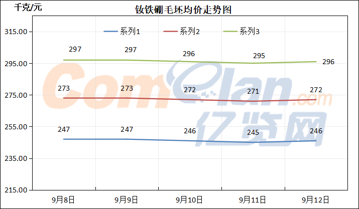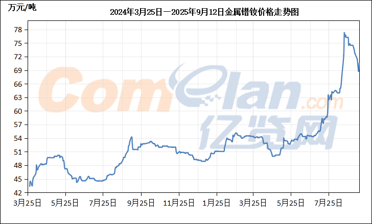 本周稀土价格下跌为主。镨钕产品价格持续下跌,主要在于市场情绪较弱,贸易商情绪偏弱,现货随之报出,下游市场买涨不买跌,采购意向较弱,成交支撑不足,报价出货持续下探,随着上游市场更低价出货减少,且到达部分磁材可接货价格,市场招标采购增加,价格小幅反弹,更多成交情绪有待观望。镝价格坚挺,铽价格下滑,镝主要在于中稀采购,市场低价出货不多,价格尚可支撑,铽因前期价格上涨,目前需求减弱,接货价格压低,价格处于回调阶段,但整体波动幅度有限,镝涨幅不大,铽继续下跌空间有限。对于后市,镨钕产品供需持续紧张,市场情绪一般,刚需采购仍存,且国庆节前备货意向尚可,预计近期稀土价格小幅震荡上调。
